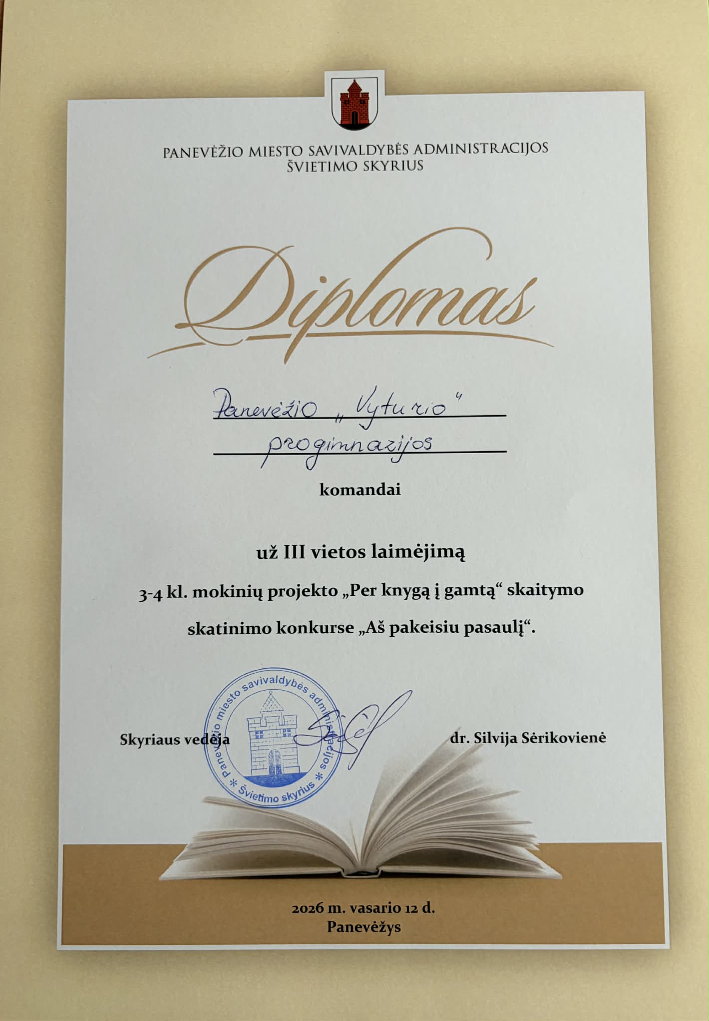 Sveikiname mūsų progimnazijos 3-4 klasių mokinių komandą: Gerdą Andriukaitytę, 4c kl., Vasarę Lukminaitę, 4c kl., Ugnę Bedrę, 3a kl., Joną Balaišį, 3b kl., dalyvavusius Panevėžio miesto 3-4 klasių skaitymo skatinimo projekto „Per knygą į gamtą“ konkurse „Aš pakeisiu pasaulį“ ir užėmusius III-iąją vietą. Mokiniai stropiai ruošėsi konkursui: skaitė tris Rebekos Unos knygas, atliko įvairias užduotis, susijusias su šiomis knygomis. Komanda apdovanota Diplomu ir atminimo dovanėlėmis.