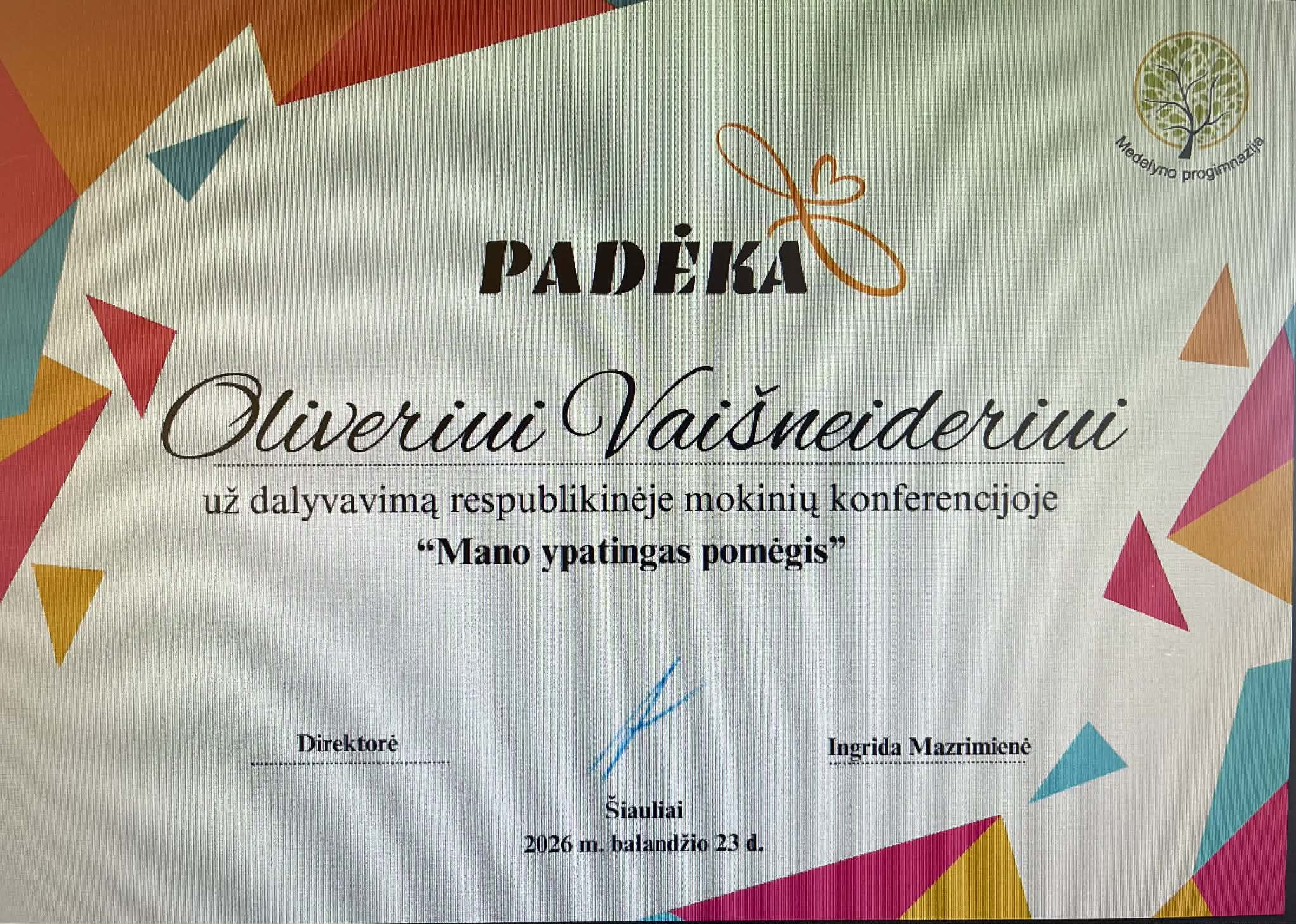 5a klasės mokinys Oliveris Vaišneideris, dalyvavo ir skaitė pranešimą Šiaulių Medelyno progimnazijos mokinių konferencijoje „Mano ypatingas pomėgis“. Konferencijos metu mokiniai pasakojo apie įvairiausius pomėgius, domėjosi kitų vaikų pomėgiais ir sulaukė nemažai klausimų. Tokios konferencijos padeda augti ir tobulėti.