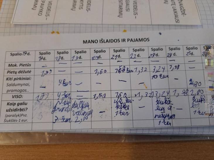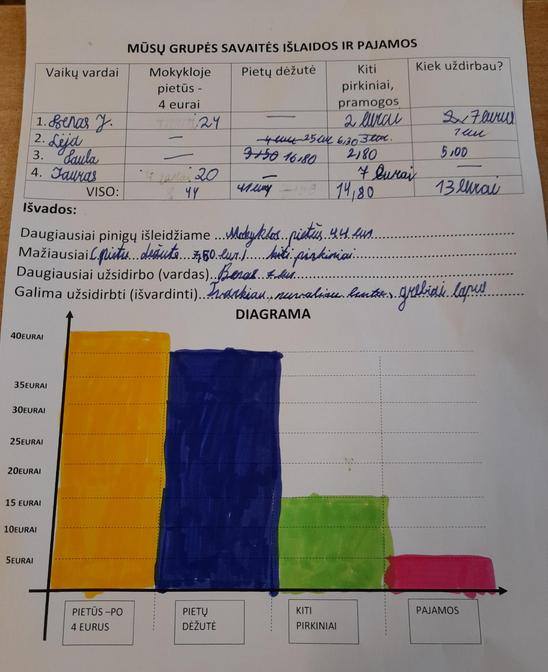 Spalio mėnesį visose trečiose klasėse vyko integruotos matematikos praktinių užduočių dienos STEAM erdvėse „Finansų matematika”. Veiklų metu mokiniai aiškinosi, ką žmonės naudojo vietoje pinigų senovėje, kokios valiutos naudojamos dabar, kas sudaro šeimos biudžetą, kaip vaikai patys galėtų užsidirbti pinigų. Visi trečiokai atliko savaitės tyrimą „Kiek pinigų išleidžiame pietums mokykloje?”. Jie kasdien lentelėje žymėjo, kiek pinigų išleido, po to surinktus duomenis analizavo, vaizdavo diagramoje, padarė išvadas ir jas pristatė klasėje. Apibendrindami temą iš antrinių žaliavų pasigamino pinigines.