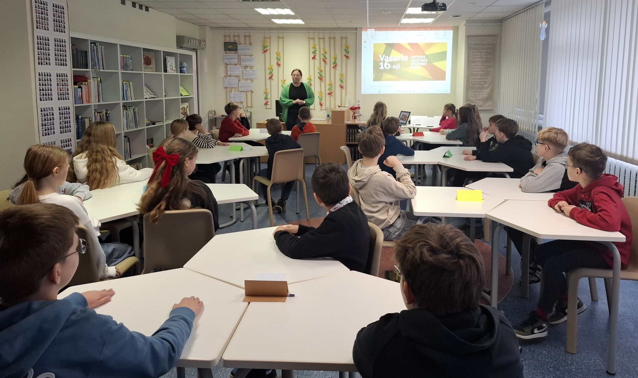 Minėdami Valstybės atkūrimo dieną ketvirtokai bibliotekoje ne tik prisiminė svarbius Lietuvai istorinius įvykius, bet ir daug sužinojo apie Vasario 16-osios gatvę, kurioje yra „Vyturio” progimnazijoje. Vaizdo klausimus ketvirtokams uždavė mokytojai, nusifilmavę gatvėje prie istoriškai reikšmingų pastatų.