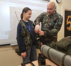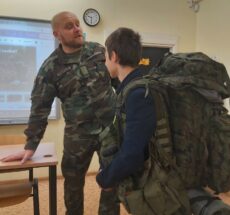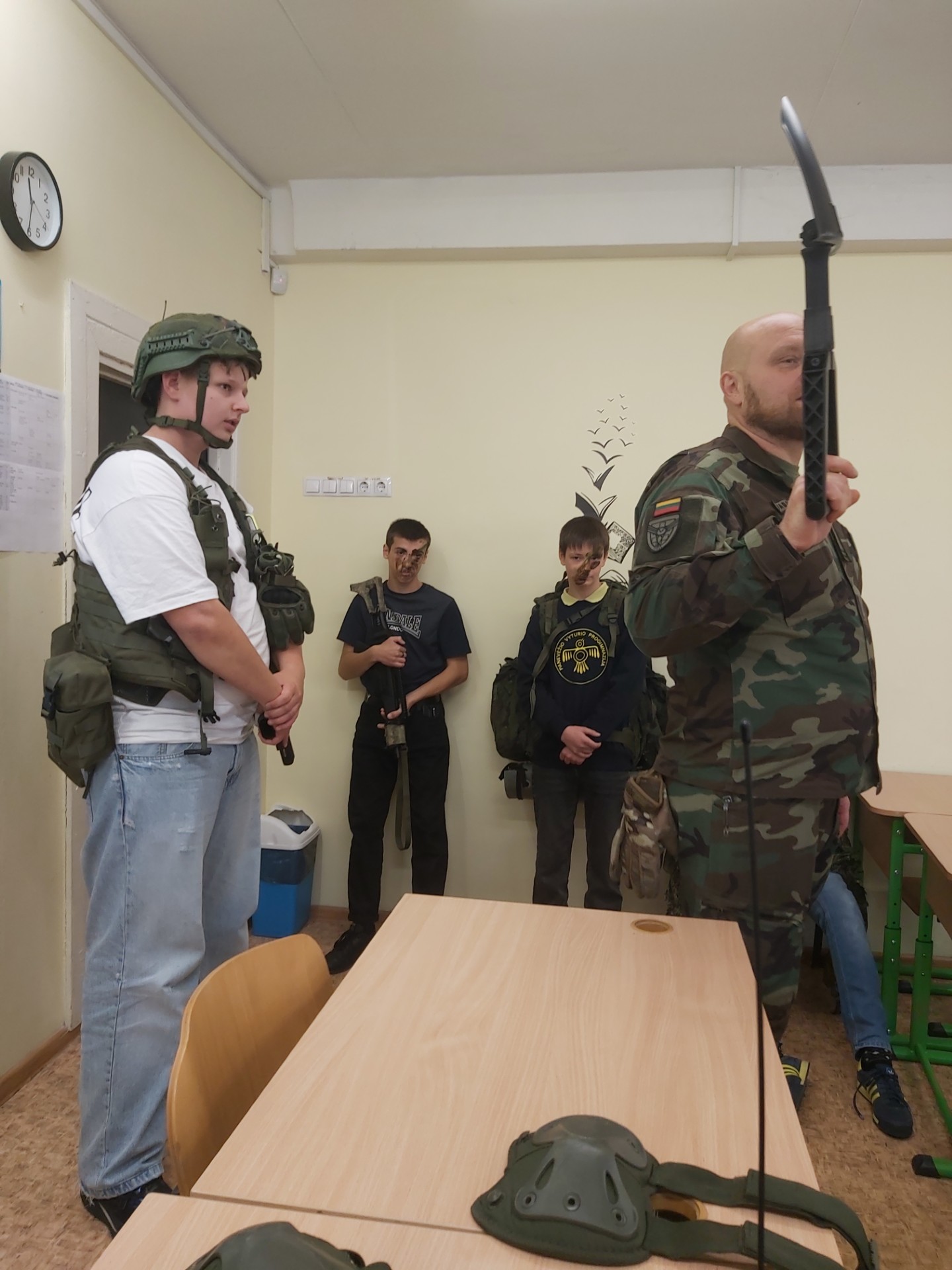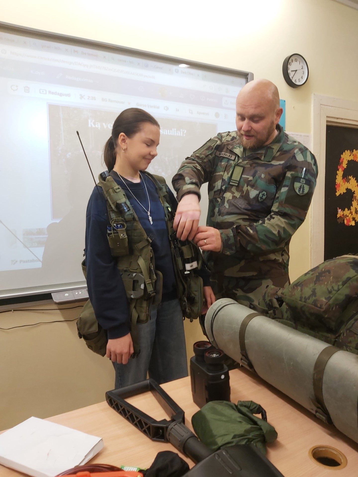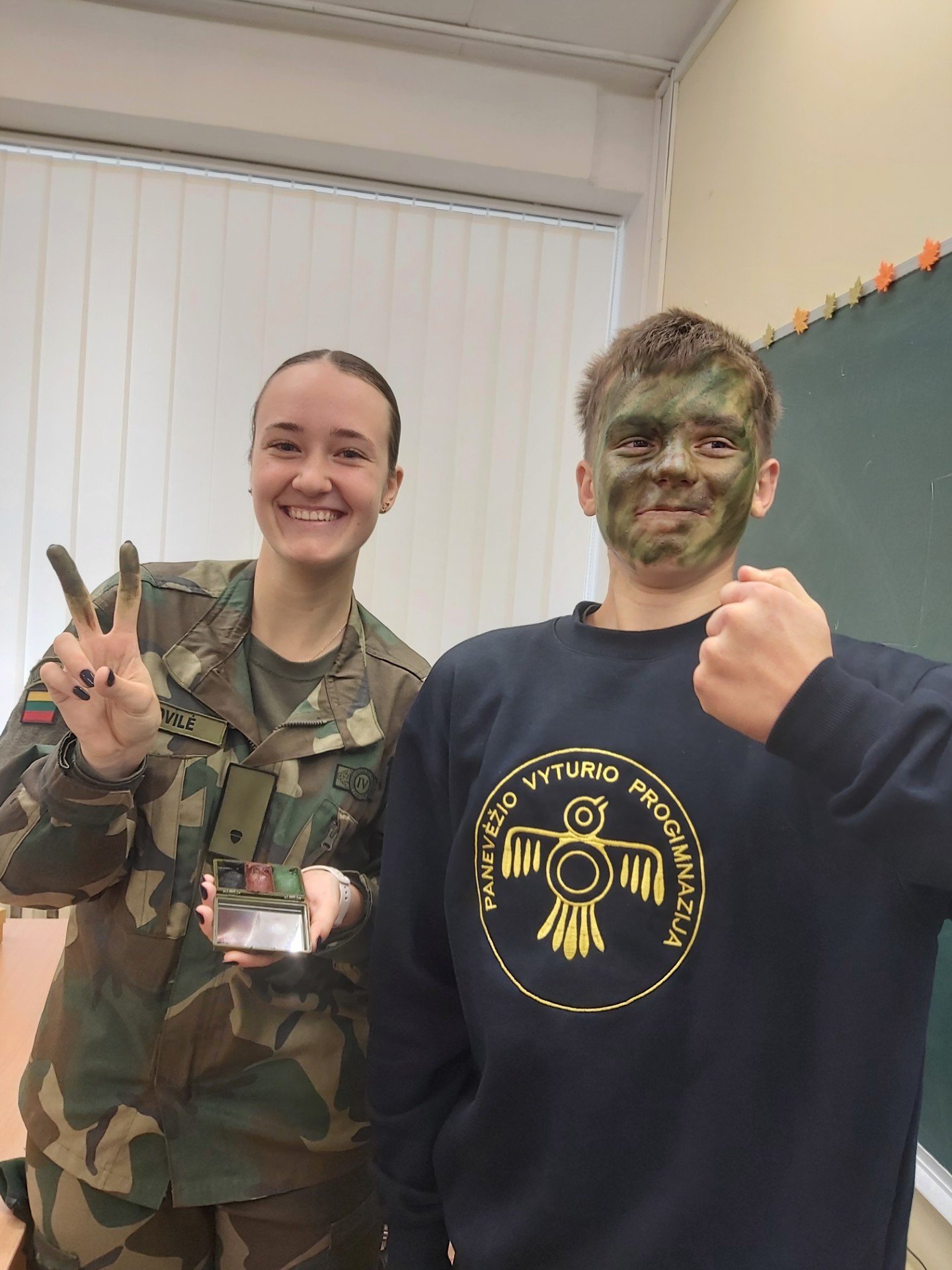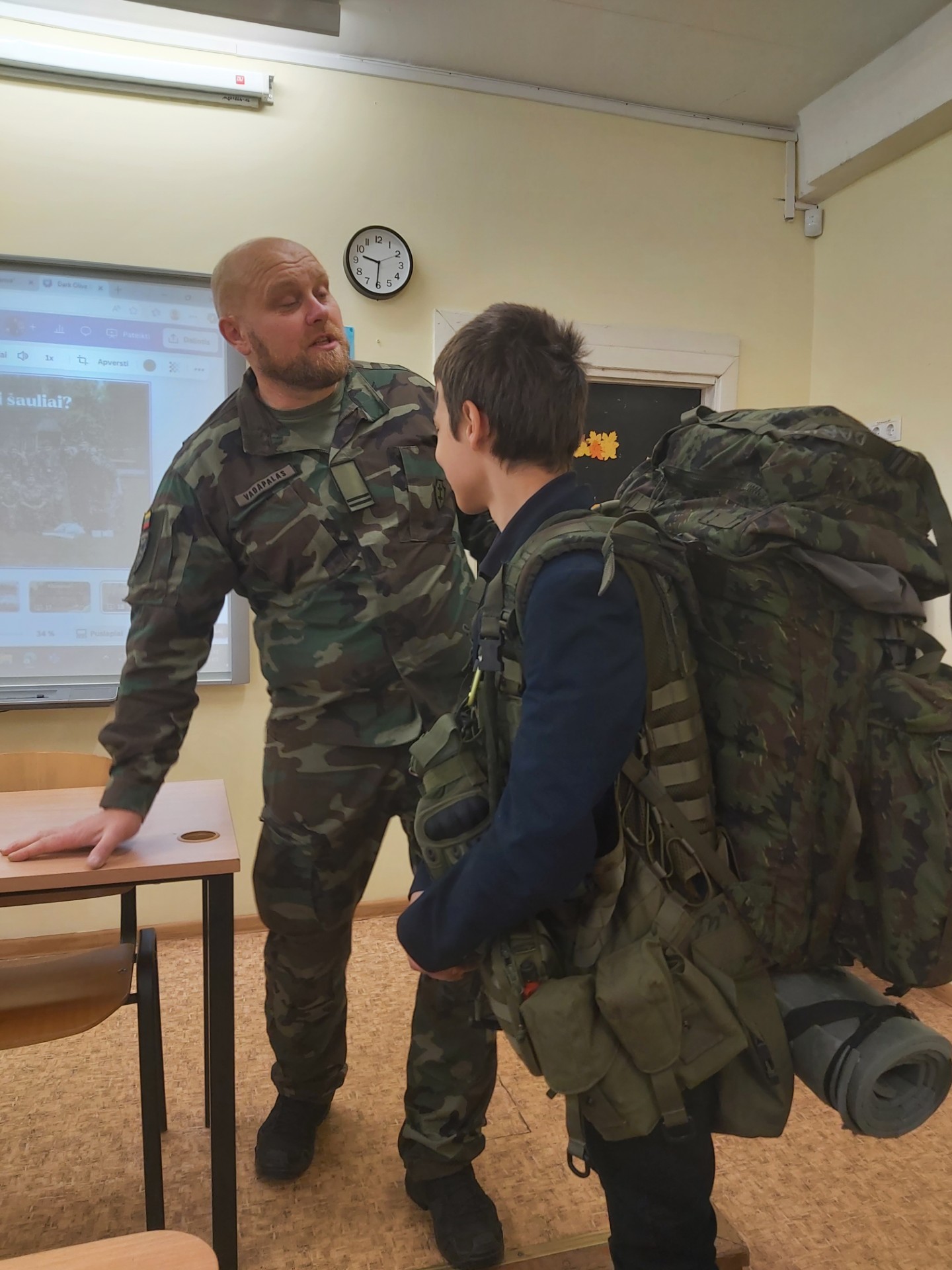 Pamokų metu mokiniai buvo aktyvūs ir išbandė kario kuprinės „jėgą“, susipažino su jos turinio paskirtimi, prisiminė turniketų naudojimo taisykles. Kareivišką makiažą išbandė ne tik vaikinai, bet ir merginos.