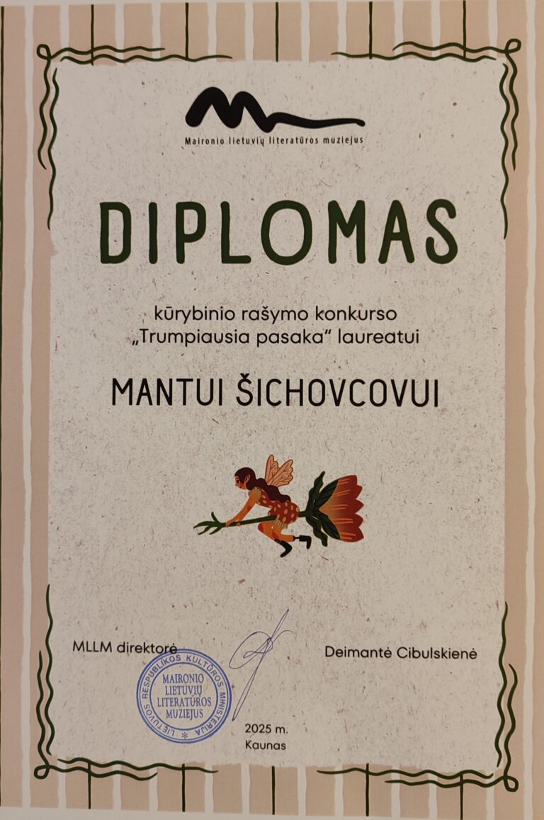 Sveikiname 4c klasės mokinį Mantą Šichovcovą, tapusį respublikinio 2-5 kl. mokinių kūrybinio rašymo konkurso „Trumpiausia pasaka“ laureatu. Konkurso, kurį organizavo Vaikų literatūros muziejus, esantis Kaune, tikslas – ugdyti mokinių kūrybiškumą, gebėjimą trumpai, bet išraiškingai perteikti mintis ir jausmus bei skatinti domėjimąsi literatūra. Konkursas sulaukė didelio susidomėjimo. Buvo atsiųsta net 231 pasaka iš visos Lietuvos! Pasakas vertino kompetentinga komisija. Gruodžio 9 d. nugalėtojai buvo pakviesti į apdovanojimo šventę, vykusią Vaikų literatūros muziejuje, kur jų laukė ne tik diplomai, šaunios dovanos, bet ir turininga literatūrinė ekskursija po muziejų.