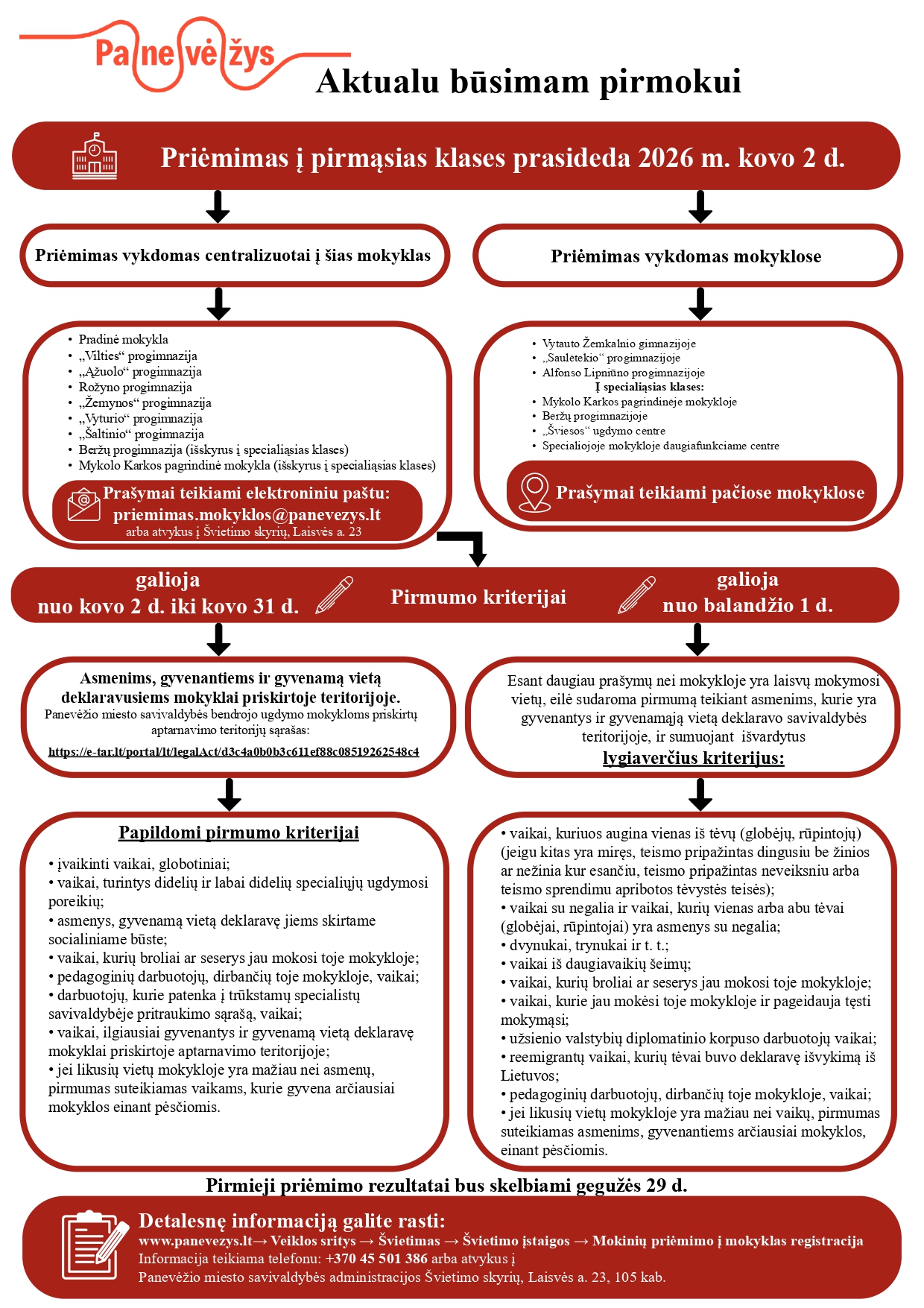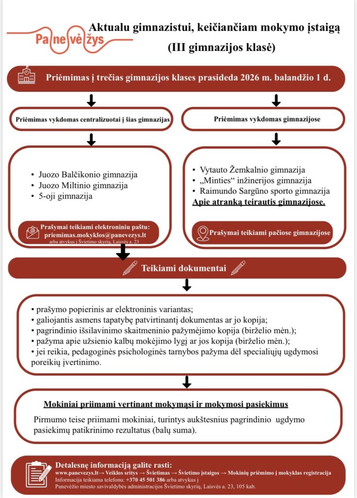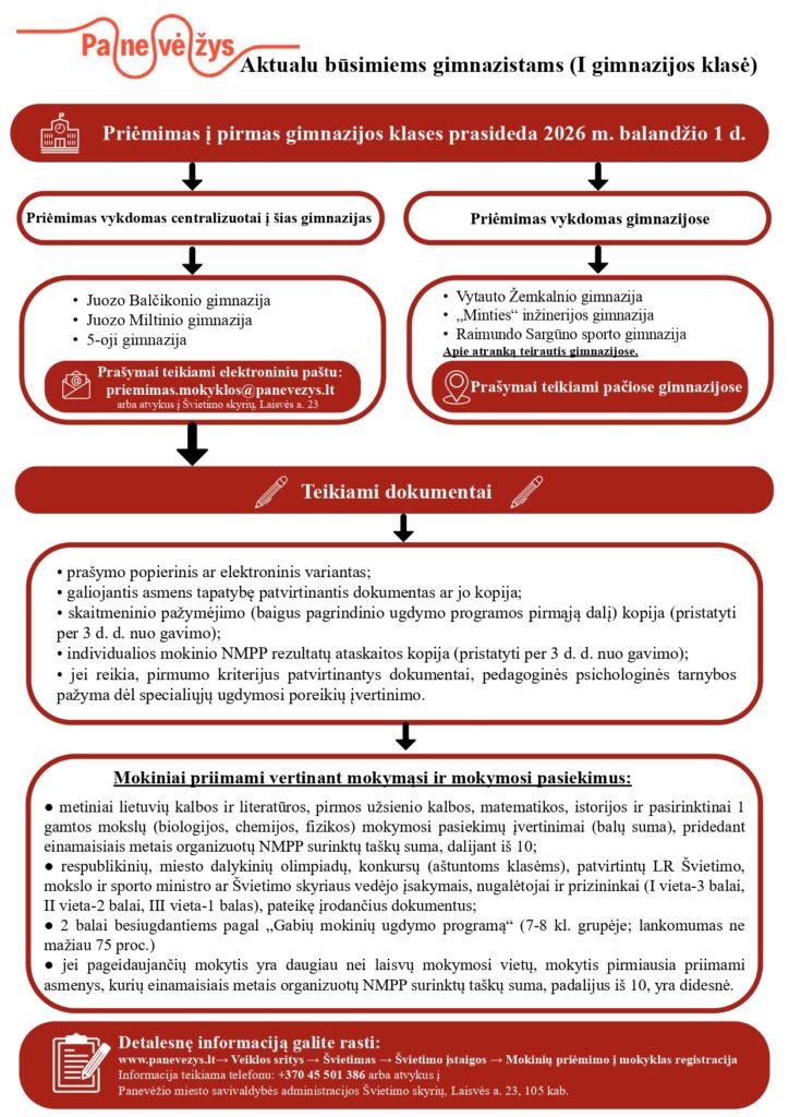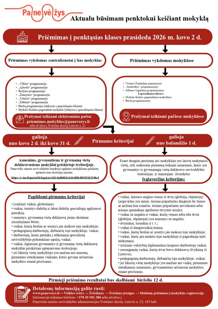 Informuojame, kad Panevėžio miesto savivaldybės tarybos 2023 m. rugpjūčio 24 d. sprendimu Nr. 1-262 „Dėl savivaldybės tarybos 2017 m. gruodžio 21 d. sprendimo Nr. 1-406 „Dėl mokinių priėmimo į Panevėžio miesto savivaldybės bendrojo ugdymo mokyklos tvarkos aprašo patvirtinimo ir Savivaldybės tarybos 2016 m. lapkričio 24 d. sprendimo Nr. 1-385 pripažinimo netekusiu galios“ pakeitimo“ keičiasi centralizuoto priėmimo į mokyklas terminai: