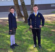- Šventinė uniforma. Mėlynas megztukas ar švarkelis su mokyklos emblema, balta palaidinė, tamsus sijonas arba tamsiai mėlynos ar juodos spalvos kelnės ar džinsai (nesuplyšę). Jokių papuošalų ir spalvotų nagų.